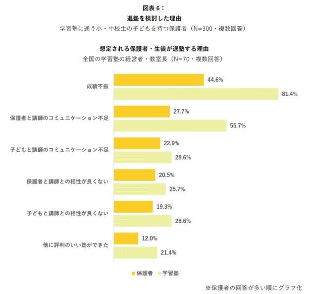 ・成績不振は想像できるが、コミュニケーションを理由に退塾を検討する保護者も多い。学習塾は保護者と円滑なコミュニケーションをとれる体制を整えることが重要になりそうだ。