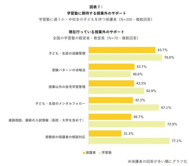 ・学習塾は受験関連のサポートを上位に回答。一方、最も保護者が求めているのは「子どもの成績管理」だった。