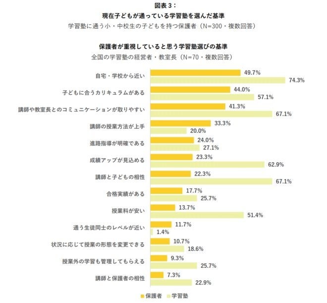 ・保護者には学習塾を選んだ基準を、学習塾には保護者が重視していると思う学習塾選びの基準を聞いた。