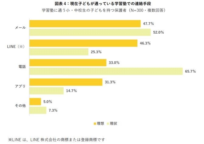 - また、保護者とのコミュニケーション内容についても、理想はメールやLINE(※)である一方で、現実としては電話が多いという結果となりました。退塾理由の共通認識としてもコミュニケーションが双方からあげられ、デジタル化をしたい部分として上位であることを考えると、デジタル化したほうが良いことはわかっていながらも塾経営の運用を変えることが難しいという実態が読み解けます。