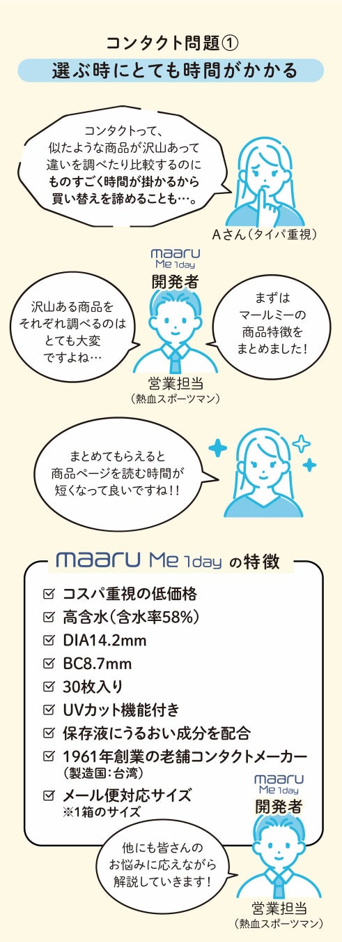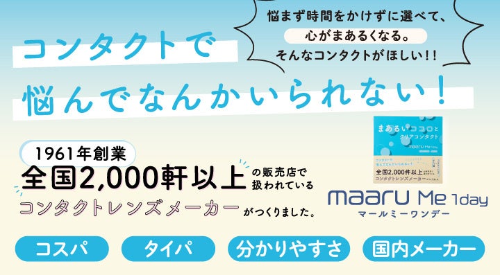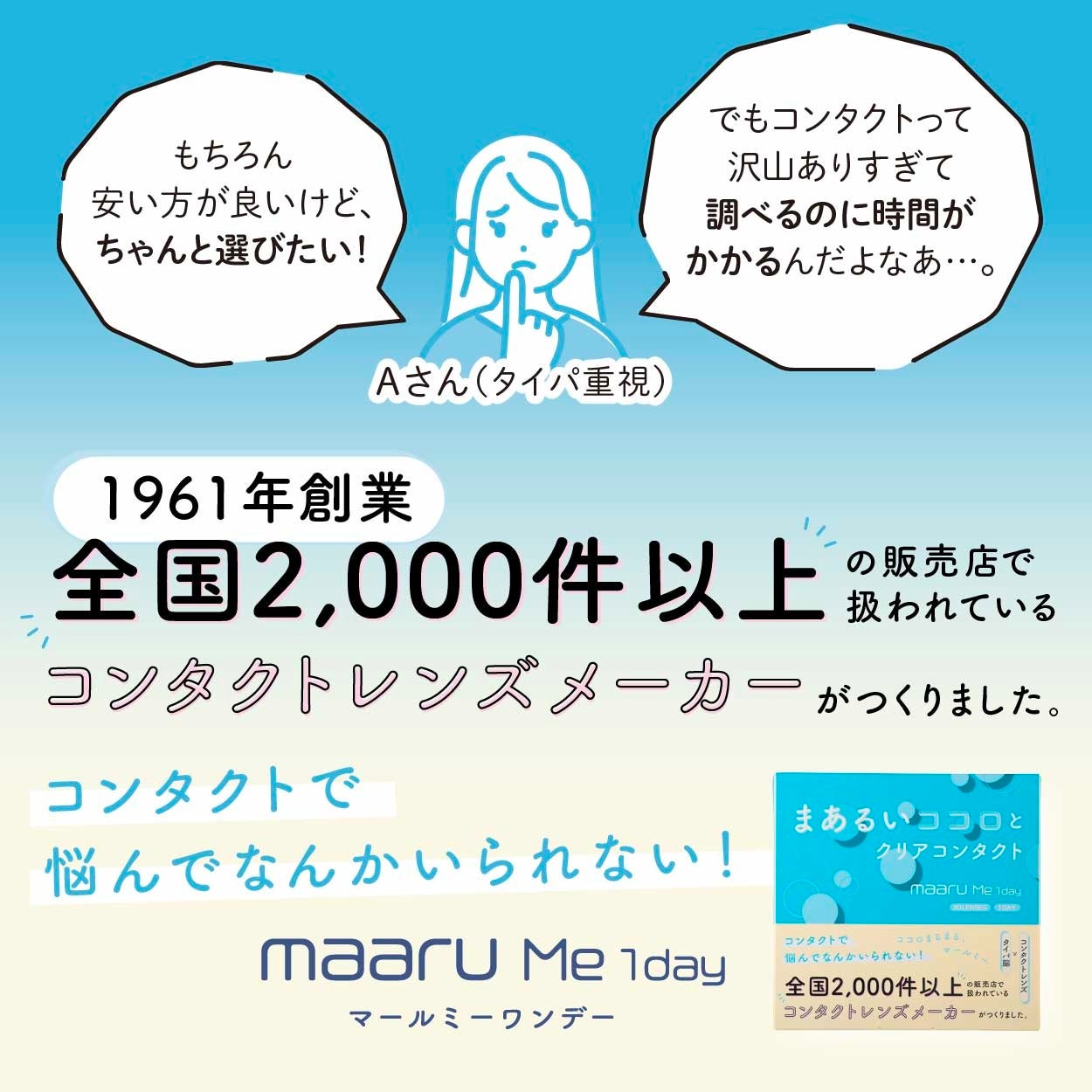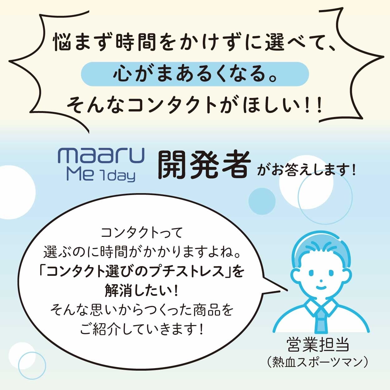 ブランド名の「マールミー(maaru Me)」には、コンタクト選びの分かりにくさにイライラして「とげとげ」してしまった心が、迷わずスマートに買い物ができることで「まあるく(円く)」なってほしい、という願いが込められています。