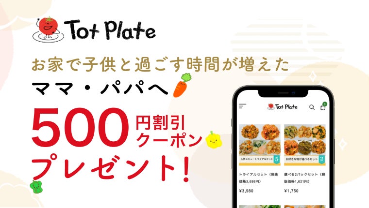 株式会社食のおくすり(所在地:東京都中央区、代表取締役:佐野こころ)が運営している子どもの健康を第一に考えた冷凍幼児食の宅配サービス「Tot Plate(トットプレート)」は、9月9日(金)〜9月22日(木)までLINE公式アカウントにご登録いただいている方に、Tot Plate公式オンラインストア(https://totplate.com/ )で使える500円割引クーポンを発行いたします。濃厚接触や外出自粛、保育園・幼稚園の休園によって自宅で多くの時間を過ごされているご家庭も多いと思います。「体調がすぐれない」「買い物に行けない」「ご飯を作るのが大変」、そんな時でもお子様の食事は必要です。お子様の食事づくりが大変なときにぜひご活用ください。