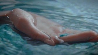 お湯をすくい、ローマ風呂の温泉を味わうように楽しむ若い外国人女性。思わず「あ~」と声が漏れる。