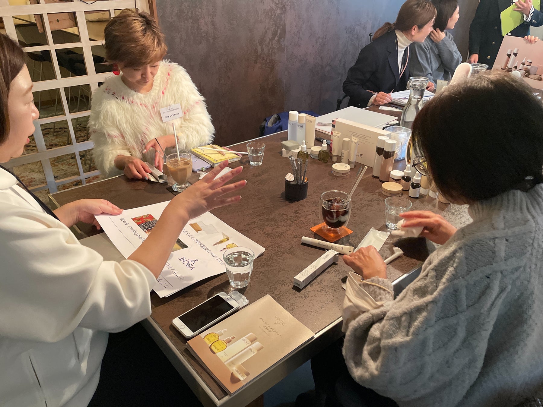 既にライン使いしている方もいれば、まだ試したことのないアイテムがある方も。気に入っているポイントや「ここをもっとこうしてほしい!」という改善点をうかがいました。お客様が初めて体験する商品に対しては「他のブランドと何が違うの?」「どのタイミングで使用するもの?」などのご質問にお答えしました。