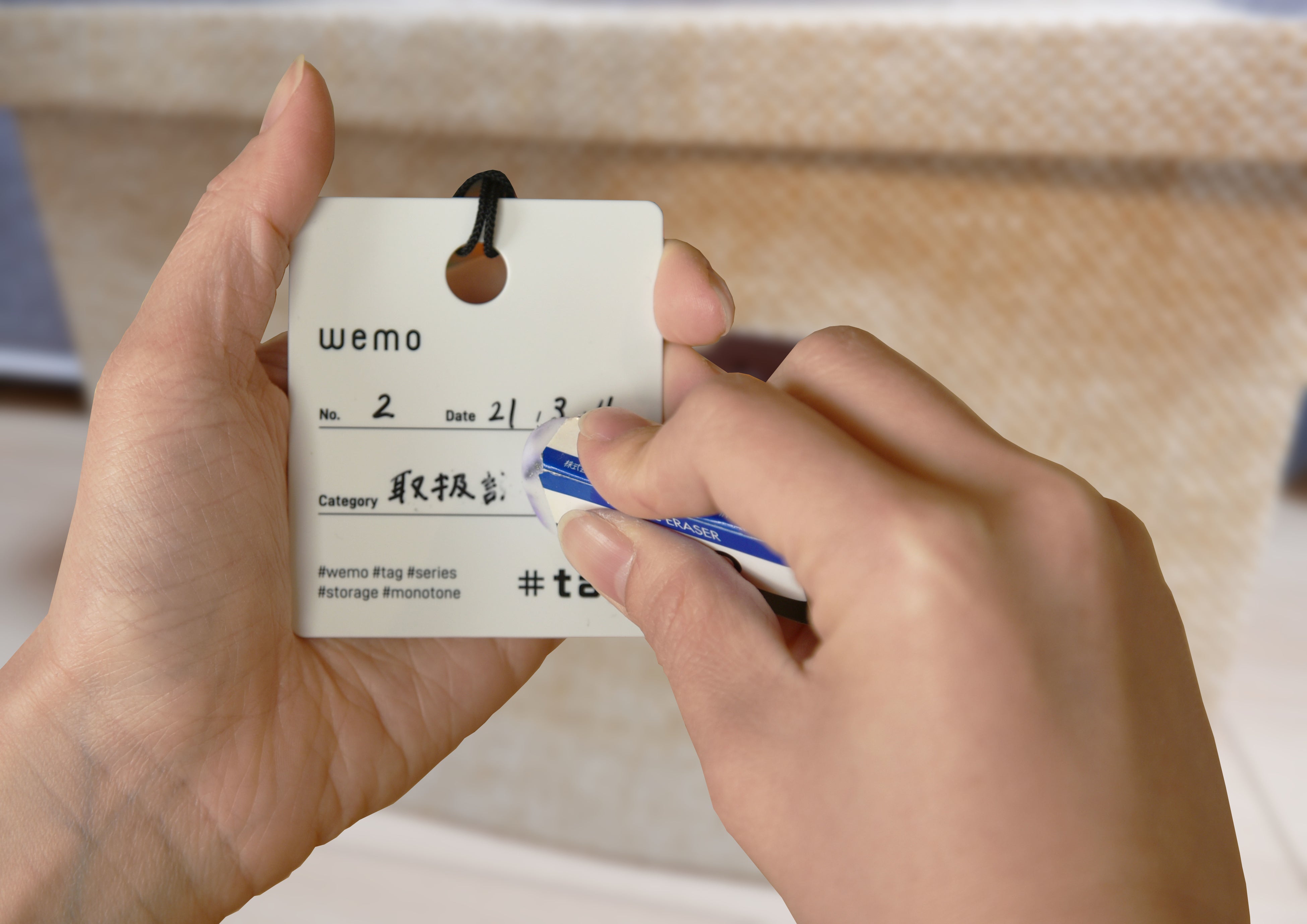 その中でもwemo #tagは「分類」や「収納」という視点から生まれたプラスチック製タグです。油性マーカーで書いて消しゴムで消せ、何度でも書き直しが可能なため、収納の場面で生じる”記憶に関するストレス”を軽減する全く新しいエコなメモツールです。