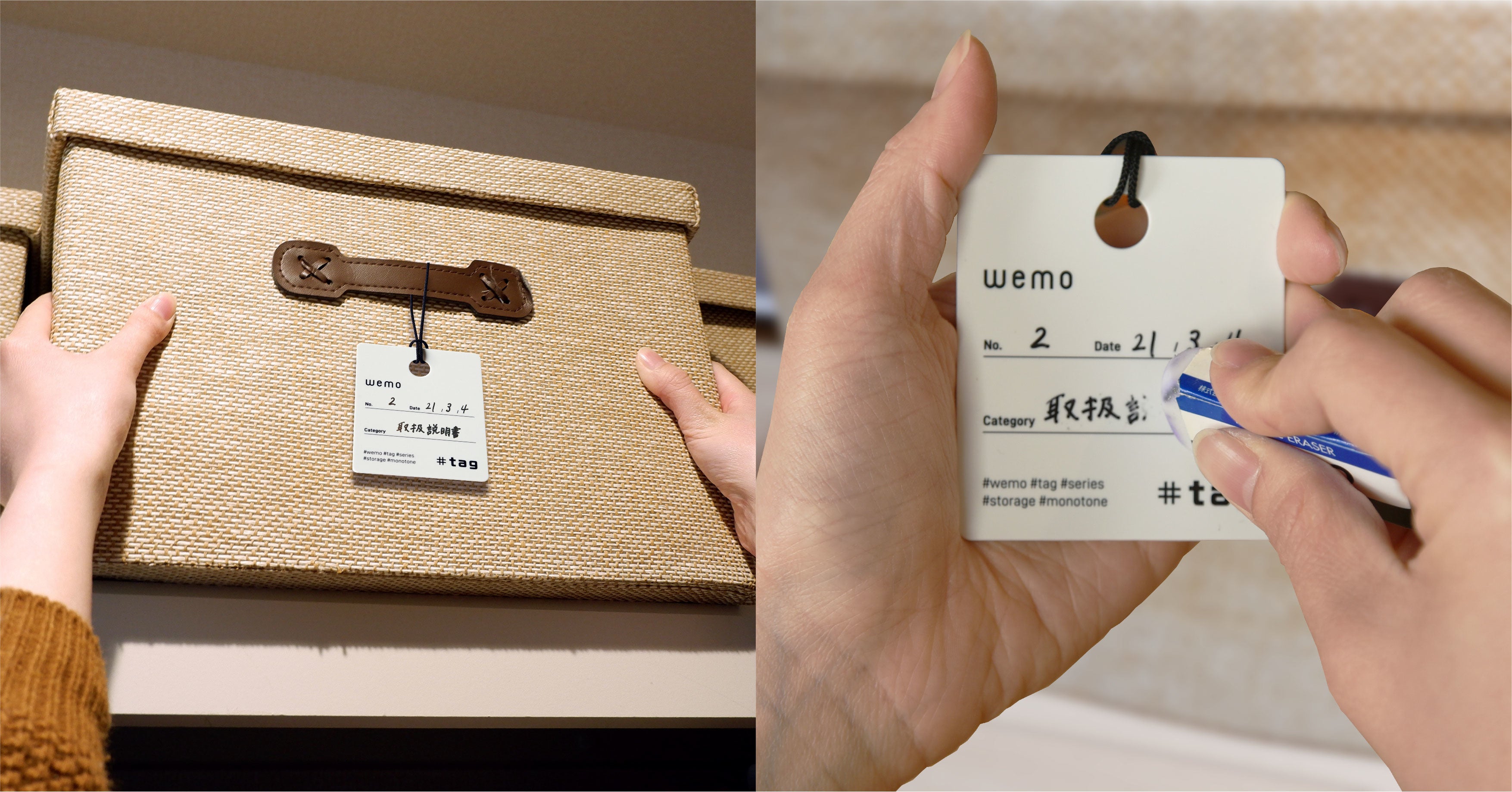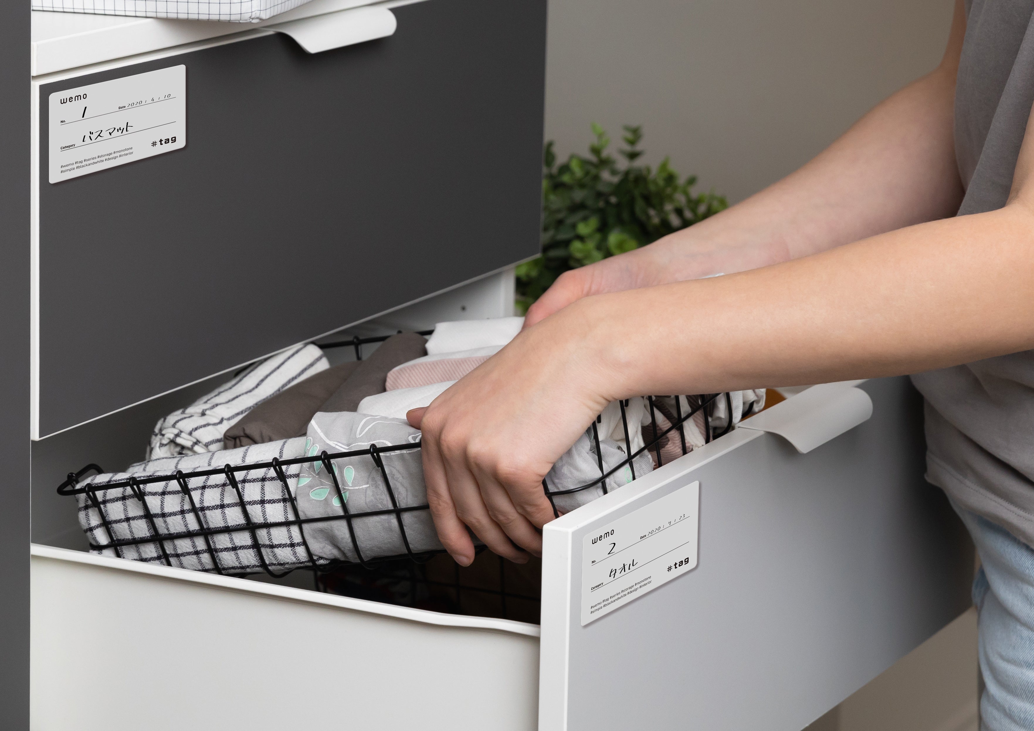収納をオシャレに見せるために「細々としたものを見えないように収納する」、「収納用具に統一感をもたせる」ことが重要ですが、中身が見えないことで”何が入っているか一目でわからない”ことがあります。wemo #tagを一般的な収納ボックスに付けるだけで、デザイン性を損なうことなく、中身を分かりやすく表示でき見た目もワンランクアップ、整理・収納の場面でのストレスを解消します。