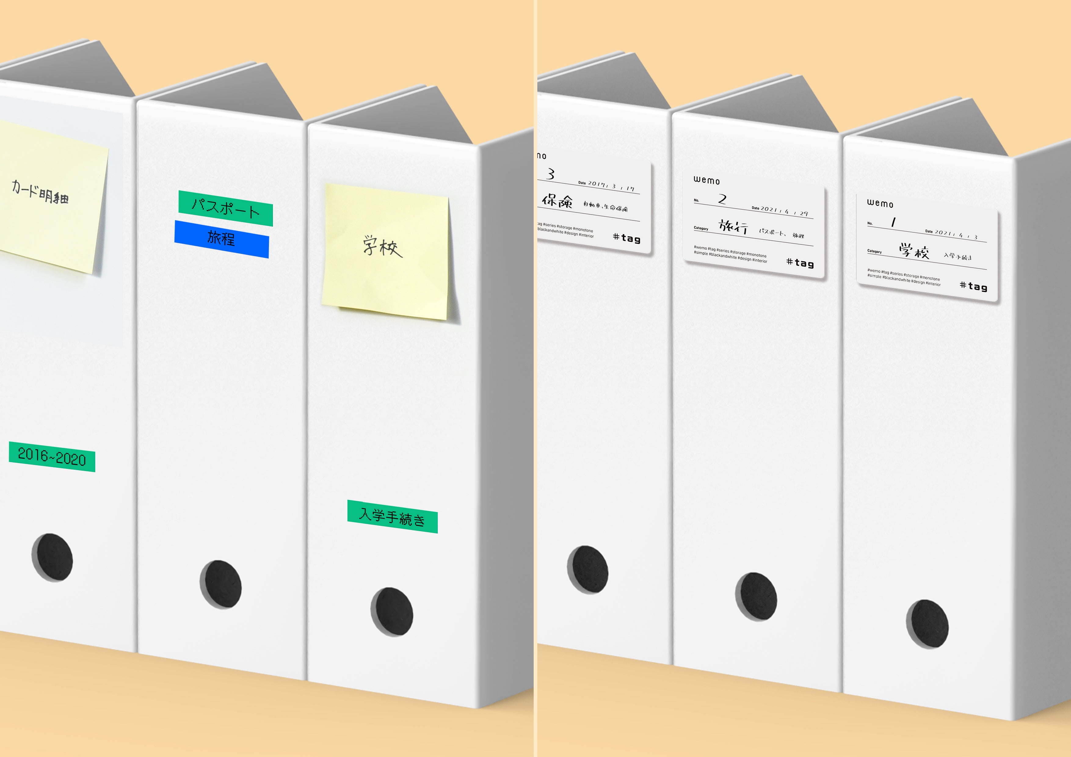 さらに、2021年8月に、使い捨てることが前提のタグシールの常識を覆し、油性マーカーで繰り返しメモして消せる「脱・使い捨て」のサスティナブルかつ便利なドキュメント収納アイテム「ReTag by wemo」を発売しました。ドキュメントファイル、インデックスファイル、インデックスシール、ラベルシールの全4種を取り揃えており、何度でも書いて消せる/貼って剥がせるなど、繰り返し長く使えます。