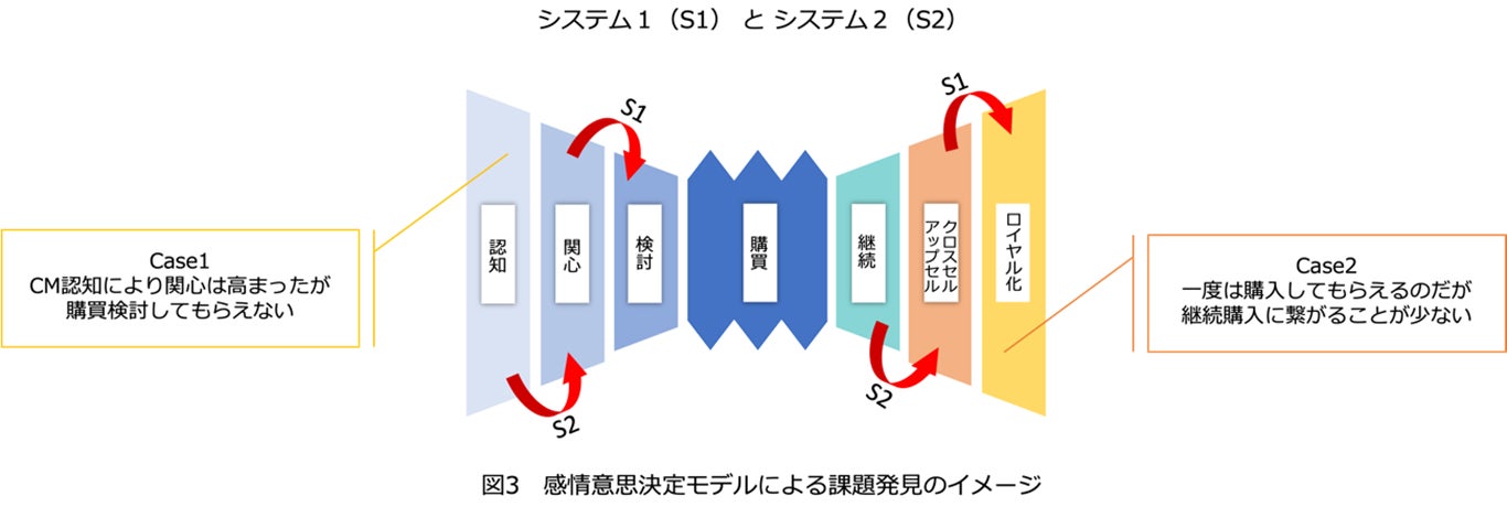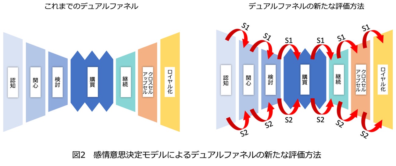 このアプローチを電通が実践しているデュアルファネルに適応し、購買シーンやターゲットとする消費者に応じた調査を行うことで、従来の手法では捉えきれなかった経時的な心理変化を詳細に把握することが可能になりました。これにより、デュアルファネルの新たな活用方法を通じて、より具体的かつ効果的なマーケティング施策を展開し、顧客体験価値を一層高めることが期待されます。(※図2)