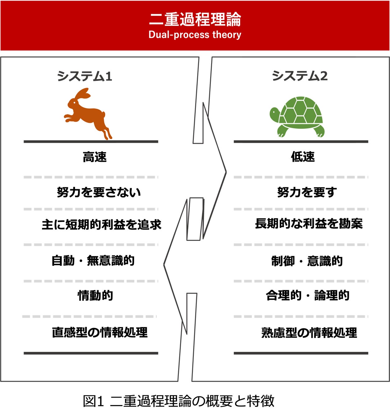 二重過程理論は、心理学や行動経済学の分野で提唱され、人間の思考が「システム1(直感的思考)」と「システム2(論理的思考)」の2つの異なるタイプの処理システムによって行われるとする理論です。この理論は購買行動において重要な役割を果たします。