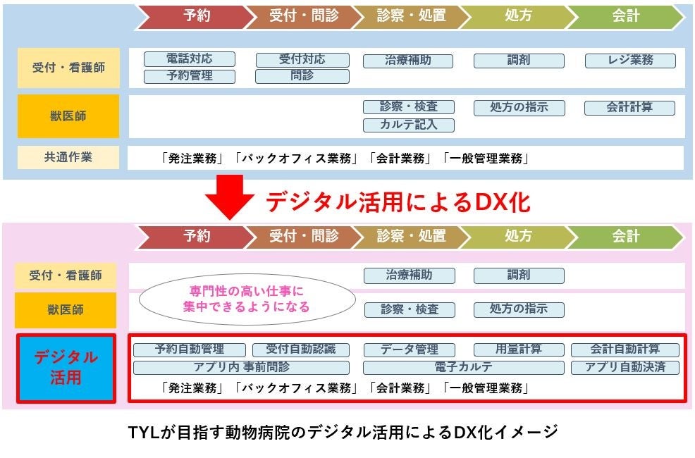 現状の問題を解決するために、TYLでは2021年5月よりアニホック往診サービスを、2022年2 月よりグループ病院の運営を開始しました。グループ病院「アニホック動物病院」をモデル店舗とすることで、実際に運営をしながらデジタル活用によるDX化を行っていきます。DX化により、獣医師をはじめとした病院スタッフが専門性の高い仕事に集中できるようになります。利用者側も、サービス提供側である動物病院の労働状況や予約システム等が改善することによって、ペットも飼い主もストレスが軽減され、利用しやすくなります。