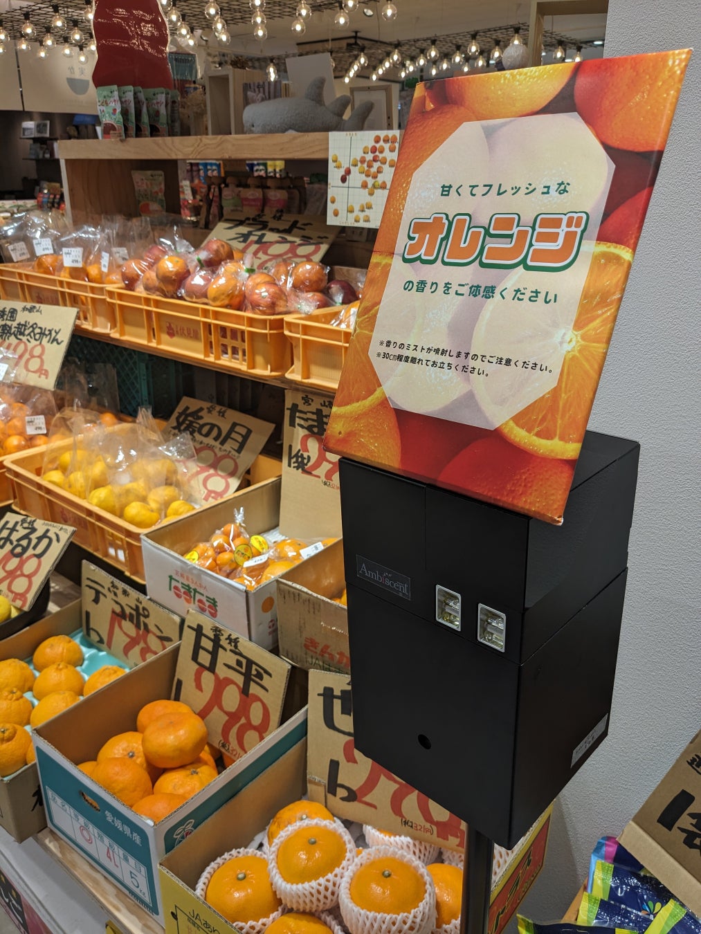 「ほのかの果実(兵庫県芦屋市)」では、柑橘が並ぶコーナーに設置。前を通ると人感センサーが反応し、「オレンジの香り」をプシュっと噴射することにより瞬時に消費者の鼻に届き、購買意欲が高まった結果、