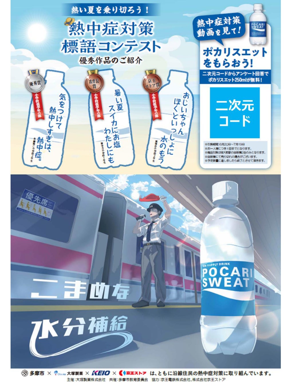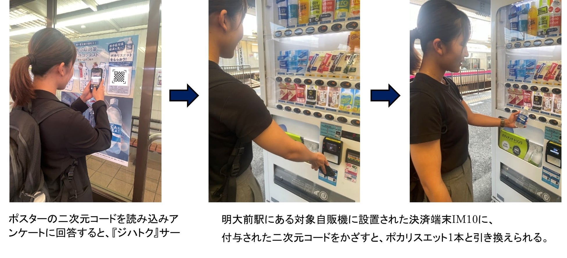 京王線・井の頭線利用客向けに各駅や待合室に掲出するポスターに記載の二次元コードを読み取り後、熱中症対策に関する動画を視聴しアンケートに回答すると、『ジハトク』サービスで利用できる自販機で飲料(ポカリスエット ペットボトル250ml)と引き換え可能な二次元コードをプレゼント。プレゼントされた二次元コードは明大前駅に設置されている大塚製薬の自動販売機のカードリーダー(IM10)に読み込ませると、ポカリスエットペットボトル250ml 1本と引き換えが可能。