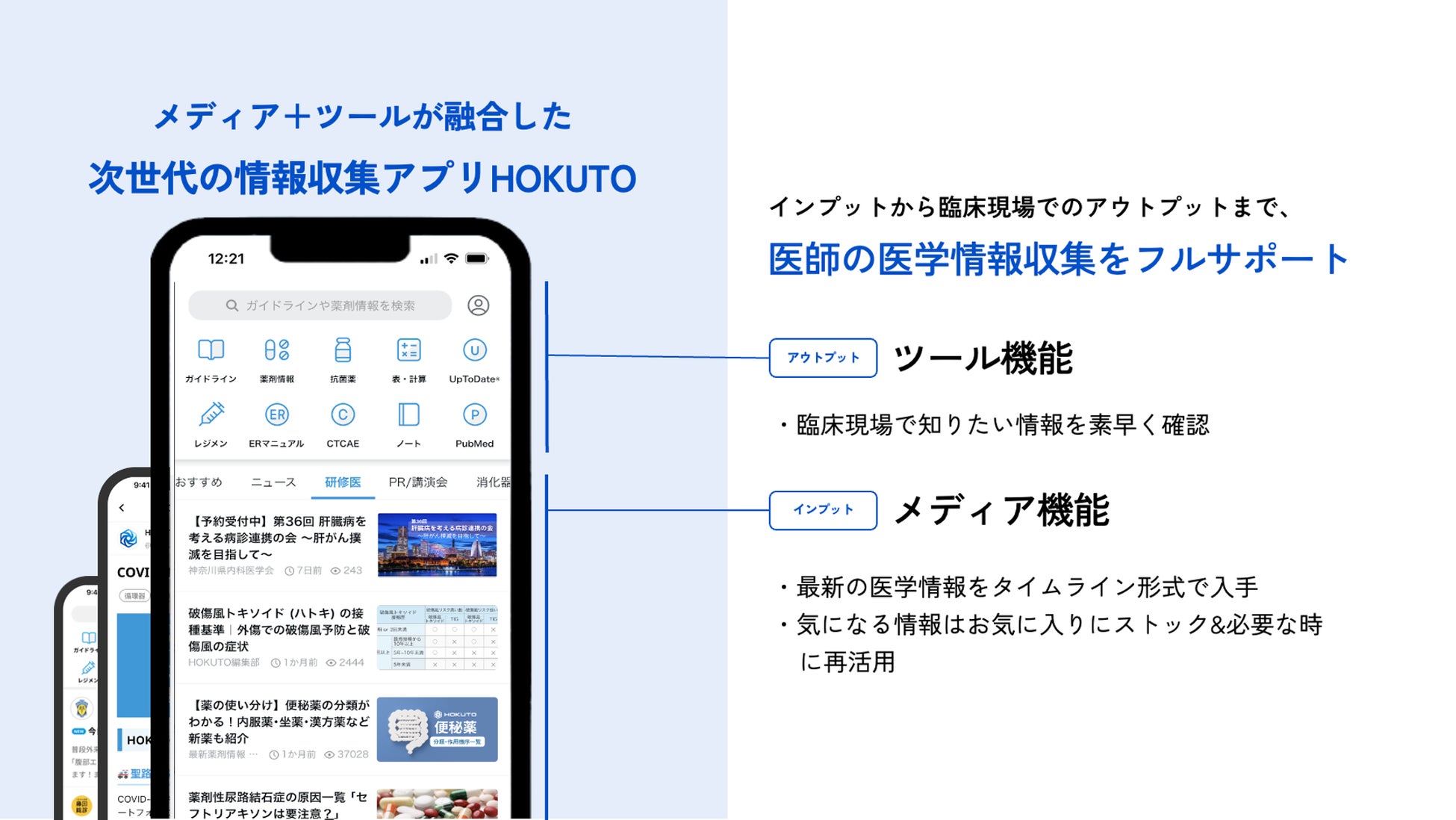「HOKUTO」は、診療時間外から診療時間中まで、医師の医学情報収集を一貫してサポートすることを目的として開発されたサービスです。 具体的には、医学情報のインプットを支えるための「メディア」としての機能と、アウトプットを支えるための「ツール」としての機能があり、それらを融合させて1つのプロダクトに落とし込んでいます。