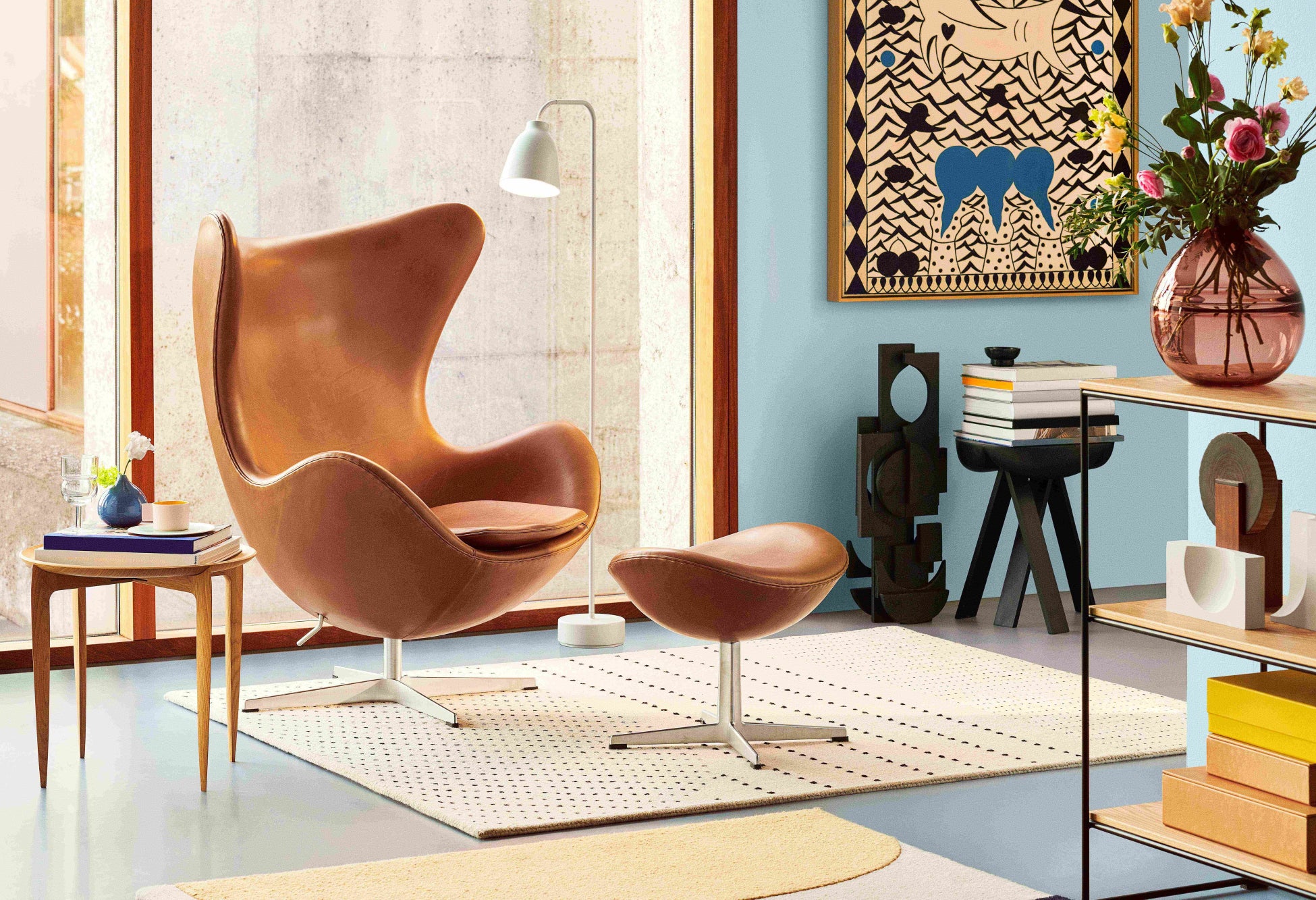 エッグチェアは、デンマークデザインにおける不朽の名作といえます。ヤコブセンは彫刻家のように、自身のガレージでワイヤーと石膏を使用した試作を繰り返し、シェルの完璧なフォルムを追求しました。今日、エッグチェアはヤコブセンの偉業を象徴するアイテムのひとつとして、またスカンジナビアのクラフツマンシップの記念碑的な作品として世界中で愛されています。エッグチェアが発売されて間もなく村内八王子の店舗では、当時国内では貴重だったエッグチェアも展示・販売していました。