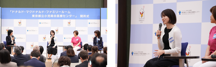 開所式では、実際に同病院で付き添い入院を経験されたご家族、東京都立小児総合医療センターの看護師、ならびにファミリールーム マネージャーによるトークセッションも実施。それぞれの立場や現場での体験をもとに、付き添い入院における心身の負担や、必要なサポートについて語られました。ファミリールームの意義や今後への期待についても意見を交わし、付き添い家族や医療現場を社会全体で支えていく取り組みの重要性を改めて実感する場となりました。