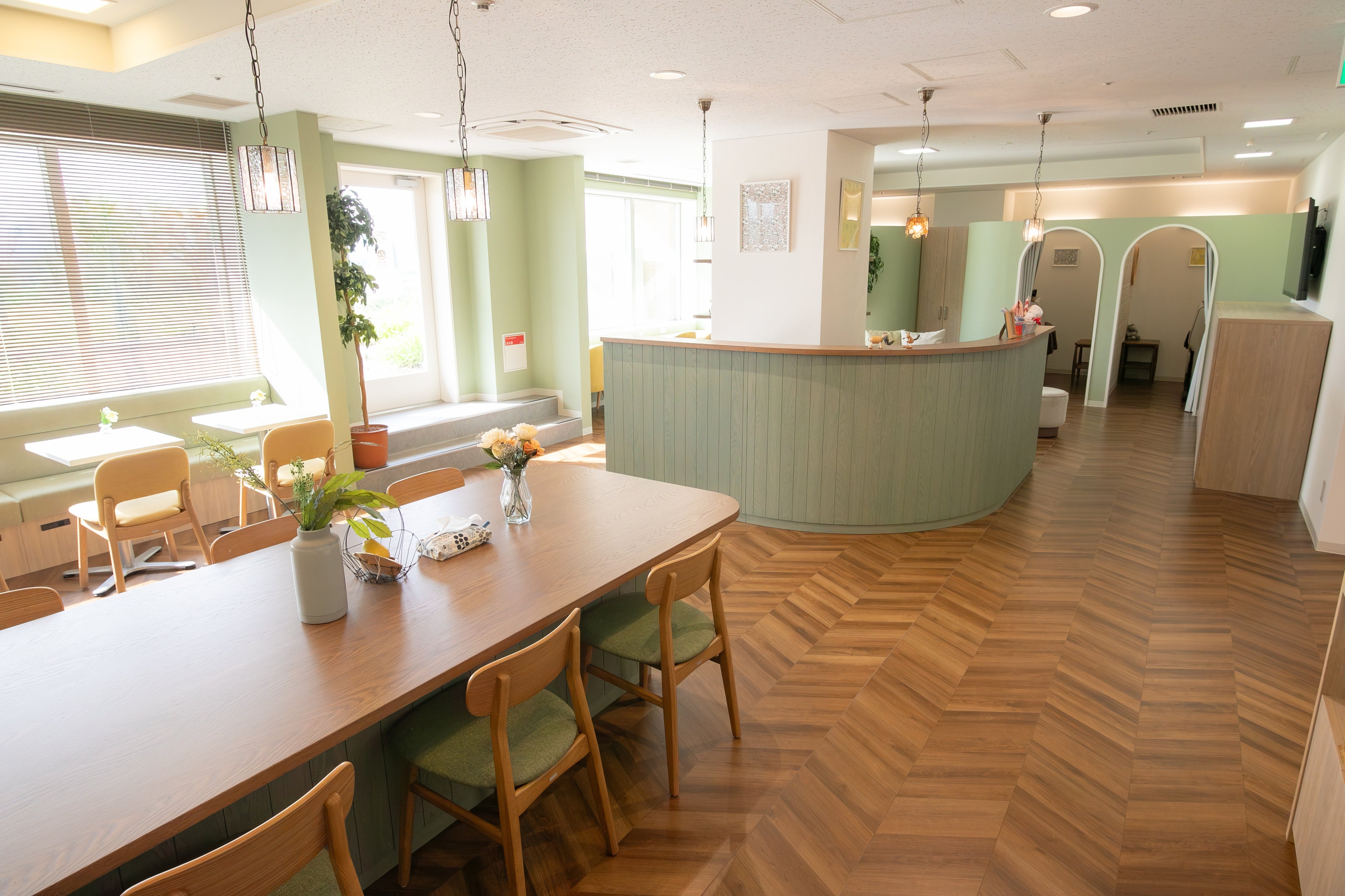 窓際のカウンタースペースでは、お食事や休憩に加え、付き添い入院の合間でニーズがあるPC作業なども行うことができます。また、付き添い家族のお声を元に、脚を伸ばしてゆったりとくつろげる「寝ころび部屋」(個室)も設けており、よりリラックスしてお過ごしいただけます。大きな窓の向こうには花と緑で彩られたデッキがあり、開放感のある眺めを楽しんだり、外の空気を吸ってリフレッシュすることも可能です。