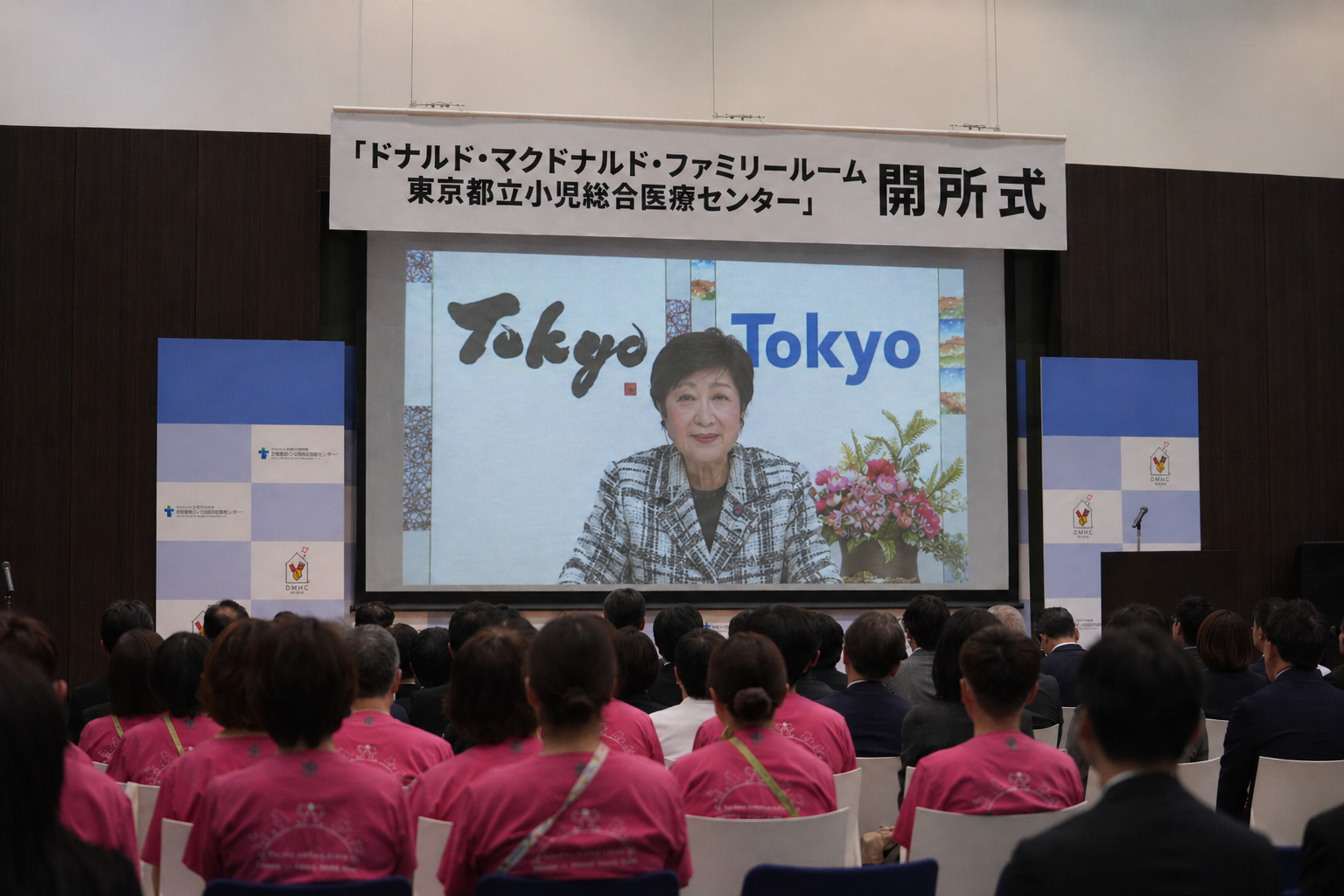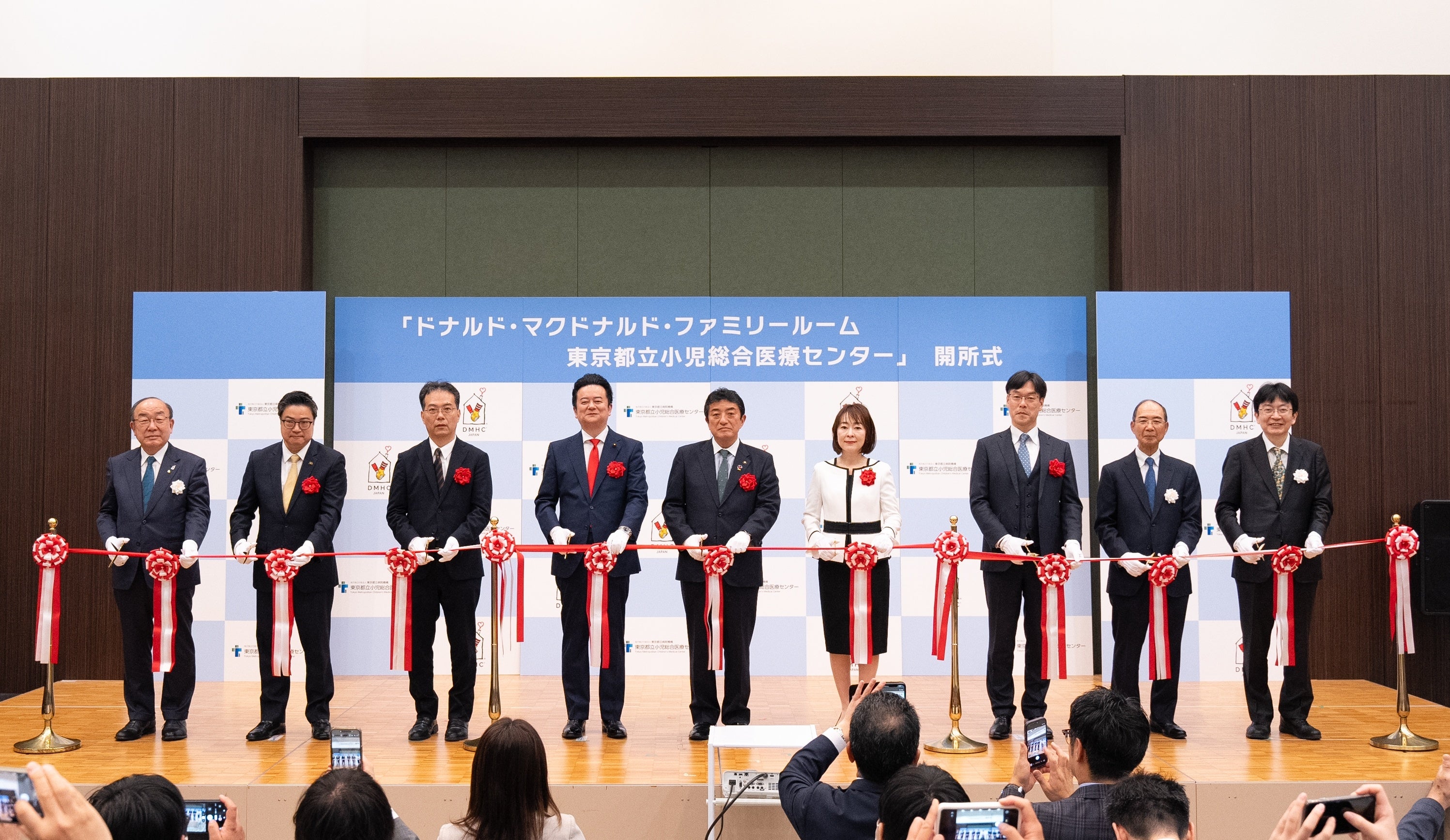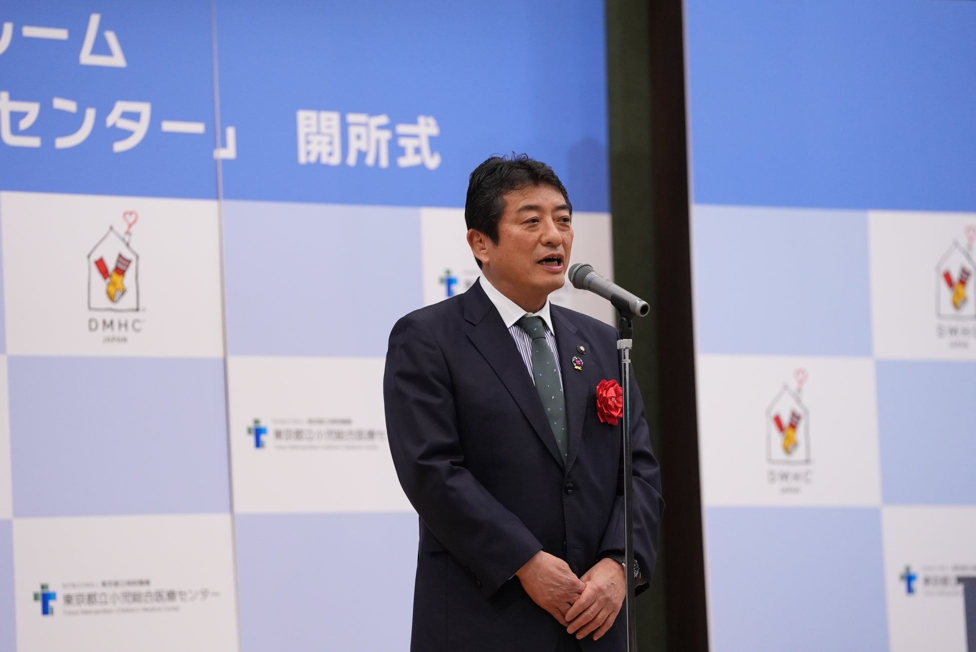 オープンに先立ち4月28日(火)に行われた開所式では、DMHC常務理事 河野辺孝則より「ファミリールーム」と「ハウス」の役割の違いなどをご説明したほか、東京都立小児総合医療センター院長 山岸敬幸より、同センターの付き添い家族支援の取り組みやファミリールーム設置の背景についてご説明しました。また、府中市長の高野律雄氏ほかご来賓の皆さまからのご祝辞にくわえ、東京都知事の小池百合子氏からもビデオメッセージにてご祝辞をいただきました。