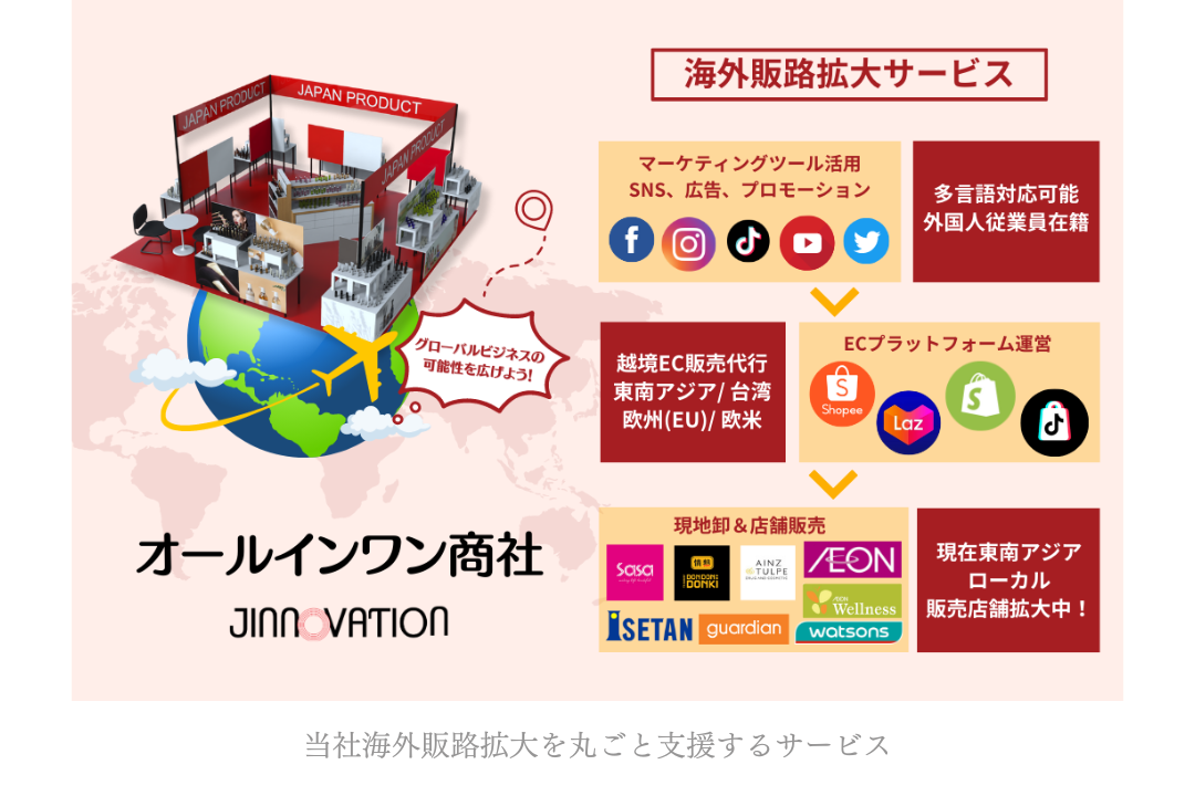 市場調査から、テストマーケティング、卸先開拓、現地でのWEB販促まで一気通貫で対応させていただいており、オールインワン商社としてワンストップ支援を行っております。