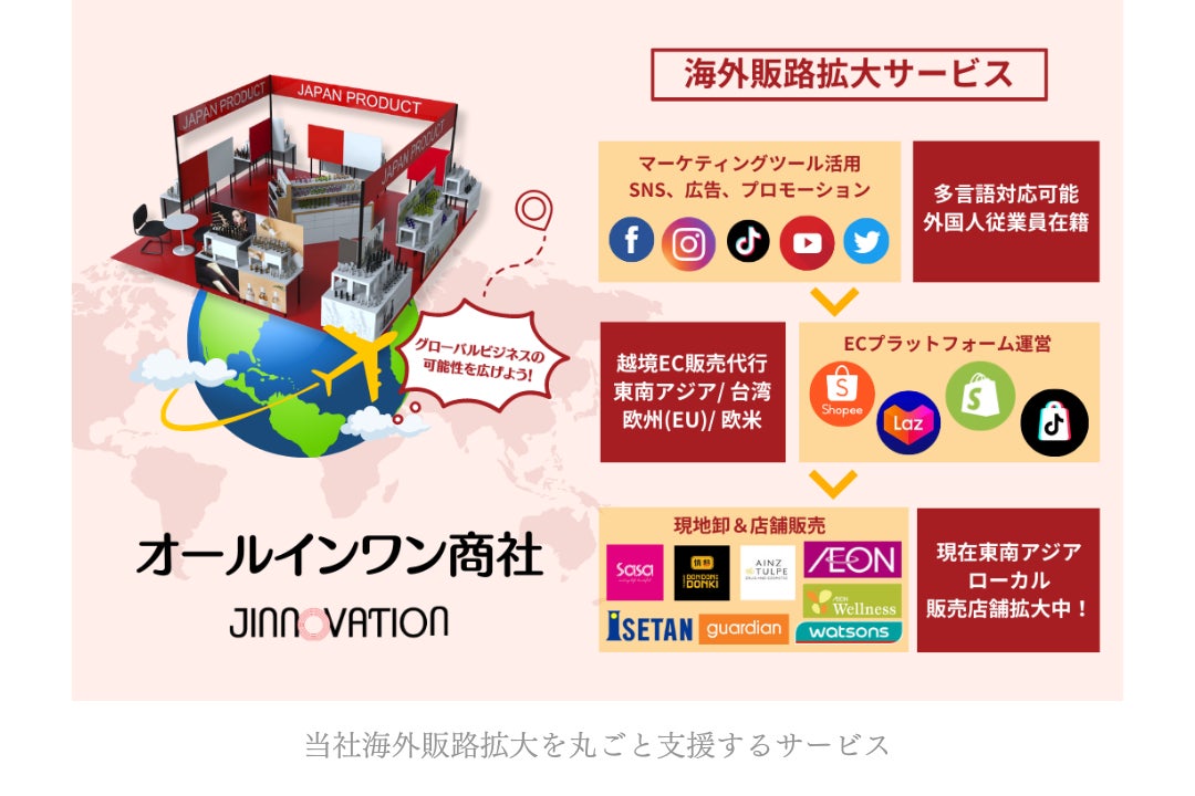 ●事業内容:海外イベント事業、雑貨・食品・化粧品・アパレル販売、物流貿易代行、海外・ 越境 EC 事業、海外事業進出・展開コンサルティング、海外メディアコンテンツ事業