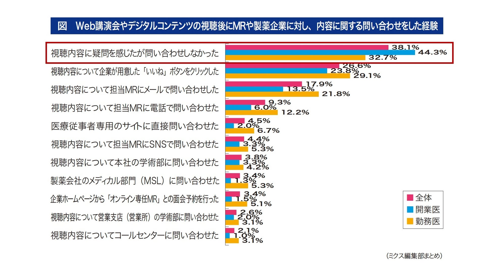 製薬企業においてウェビナーは、コロナ禍によるデジタル化や医師の働き方改革を背景に、役割を強めています。多忙な医師に効率的に情報を提供できる一方、調査によれば約4割の医師が視聴後に質問があっても問い合わせをしていない現状があり、情報が一方通行で終わるケースが課題とされています。(下図 参照)