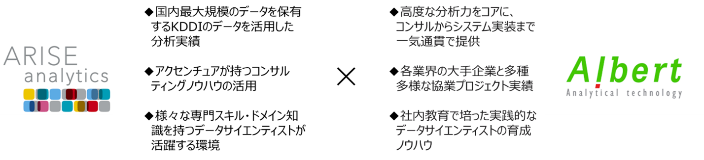 一方、ALBERTは2005年の創業以来培ってきたデータ分析力を軸に、「産業に実装されるAI活用のパートナー」として事業を展開しています。2018年のKDDIとALBERTの資本業務提携を機に、ARISE analyticsとALBERTはビッグデータ分析のプロジェクト等における協業のほか、両社共同でKDDIの社内アナリティクス人材育成プログラムに対して、実践的な育成プログラムの提供等に取り組んできました。(*2)