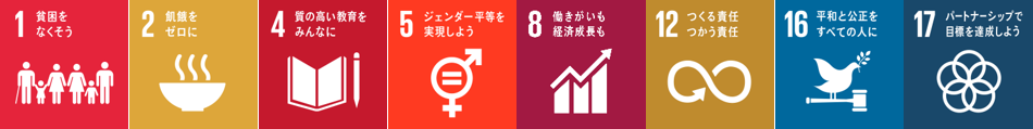 ACEが取り組む活動は、児童労働・強制労働撤廃のSDG8.7を含むSDG8「働きがいも経済成長も」のほか、下記の通り複数の分野の目標に関連しています。