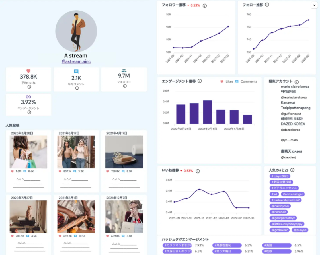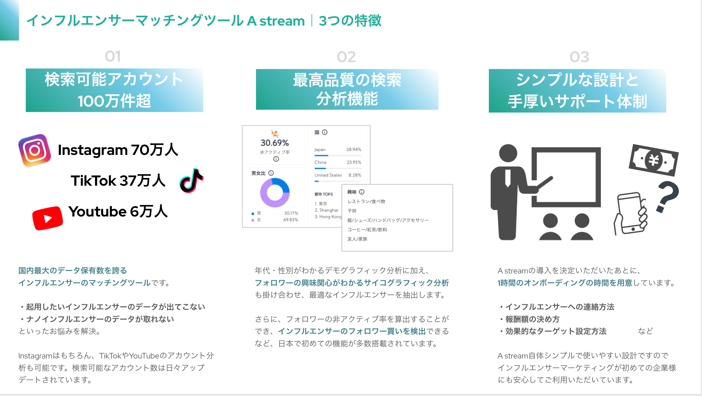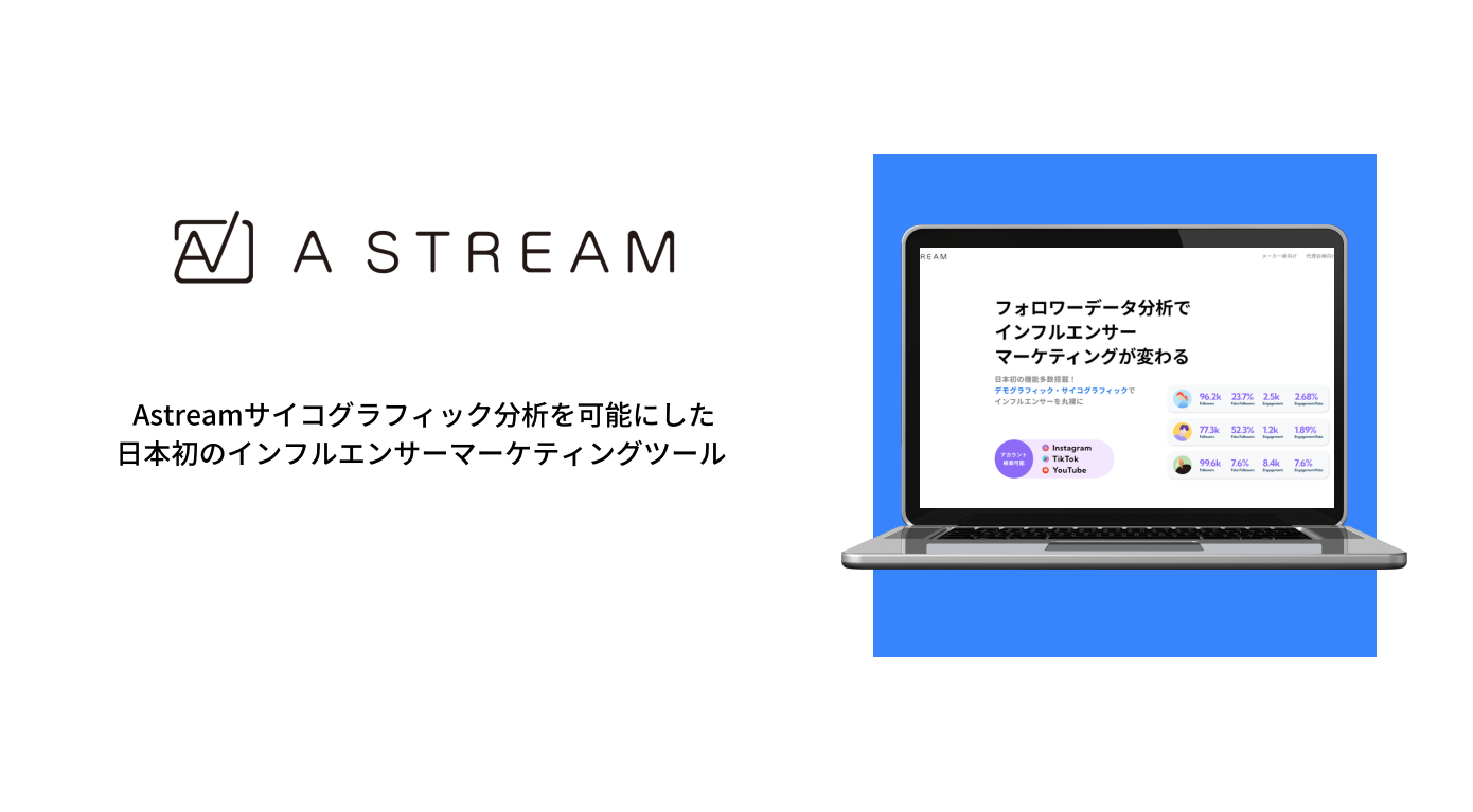 『A stream』はこれまで取得不可能であった、インフルエンサーのフォロワーの”興味関心”や”ブランドの好み”といったサイコグラフィック情報の分析を可能にする新時代のAIマーケティングツールです。