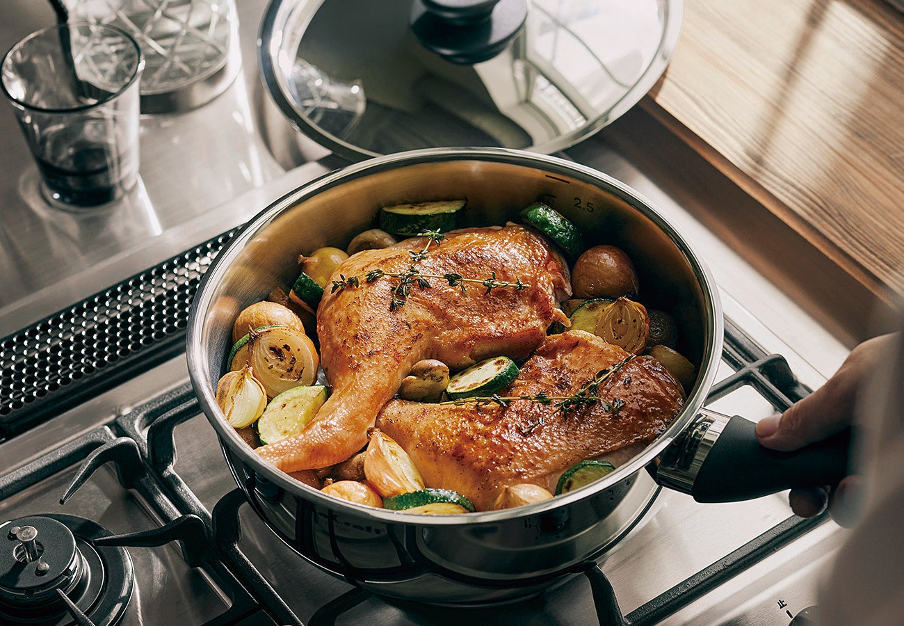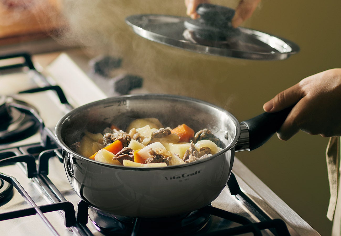 内側も全面ステンレスで、ビタクラフトならではの無水調理はもちろん、無油調理、揚げもの、炊飯、オーブン調理など多彩な使い方ができ、熱源も選ばないため調理の幅が広がります。