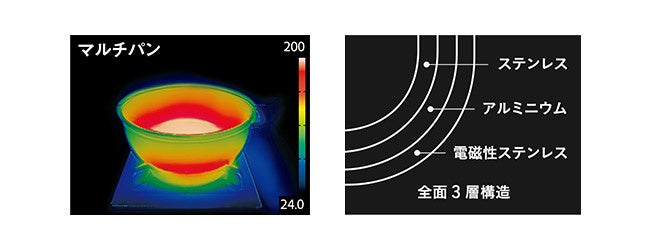ステンレス+アルミの全面2層構造によって、高い熱吸収性、熱伝導性、保温性が生まれます。