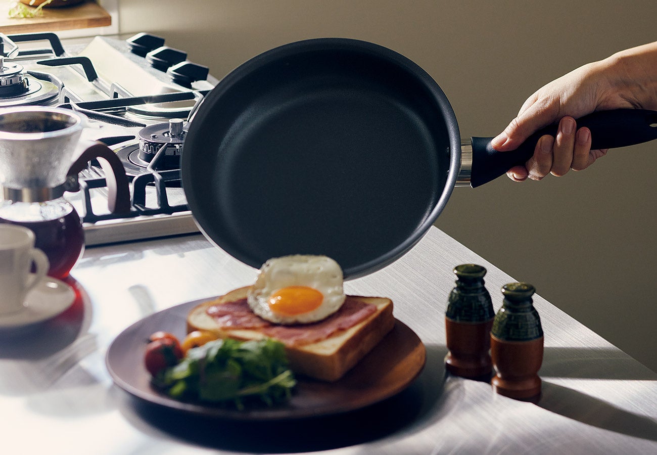 フライパン、ウォックパン、エッグパンの内側は、PFOA不使用のふっ素樹脂コーティング「ビタコート®」で加工。3層スーパーハードコートがこびりつきを防ぎ、快適な使い心地を実現します。