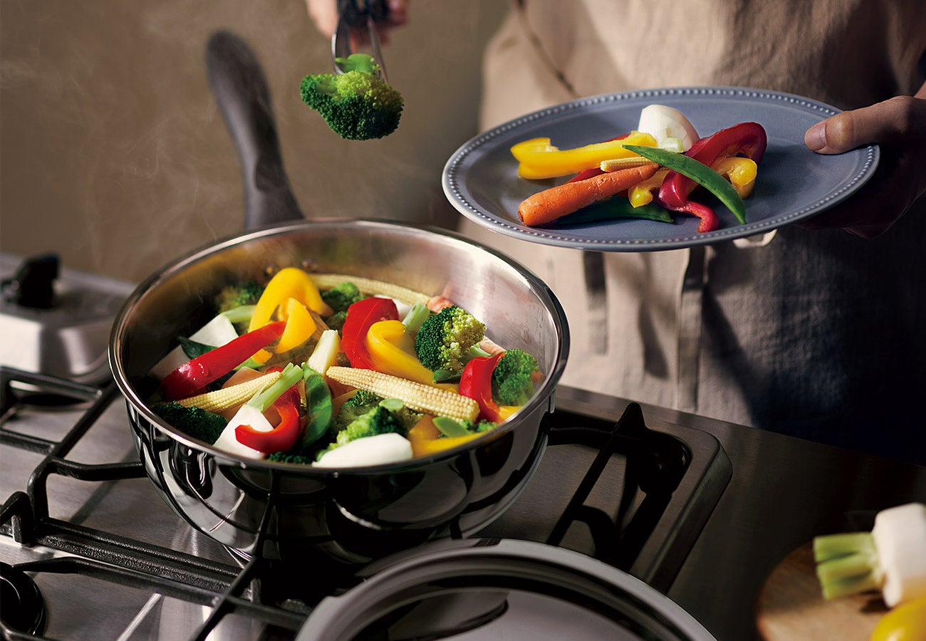 水に溶けやすい栄養素の損失を最小限に抑えるだけでなく、全面3層構造の優れた熱効率が短時間調理を可能にし、熱による栄養素の損壊も防ぎます。