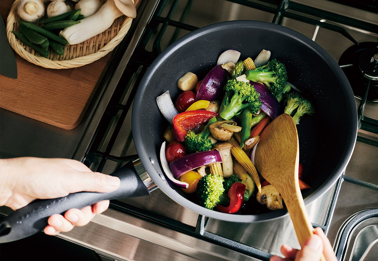 この抜群の熱効率で、熱ムラなく均一に熱を伝え、食材を入れても温度が下がりにくく、余分な水気を飛ばすことで野菜などは歯触りの良い食感に。手早い調理で食材を焦がさず色鮮やかに仕上げます。