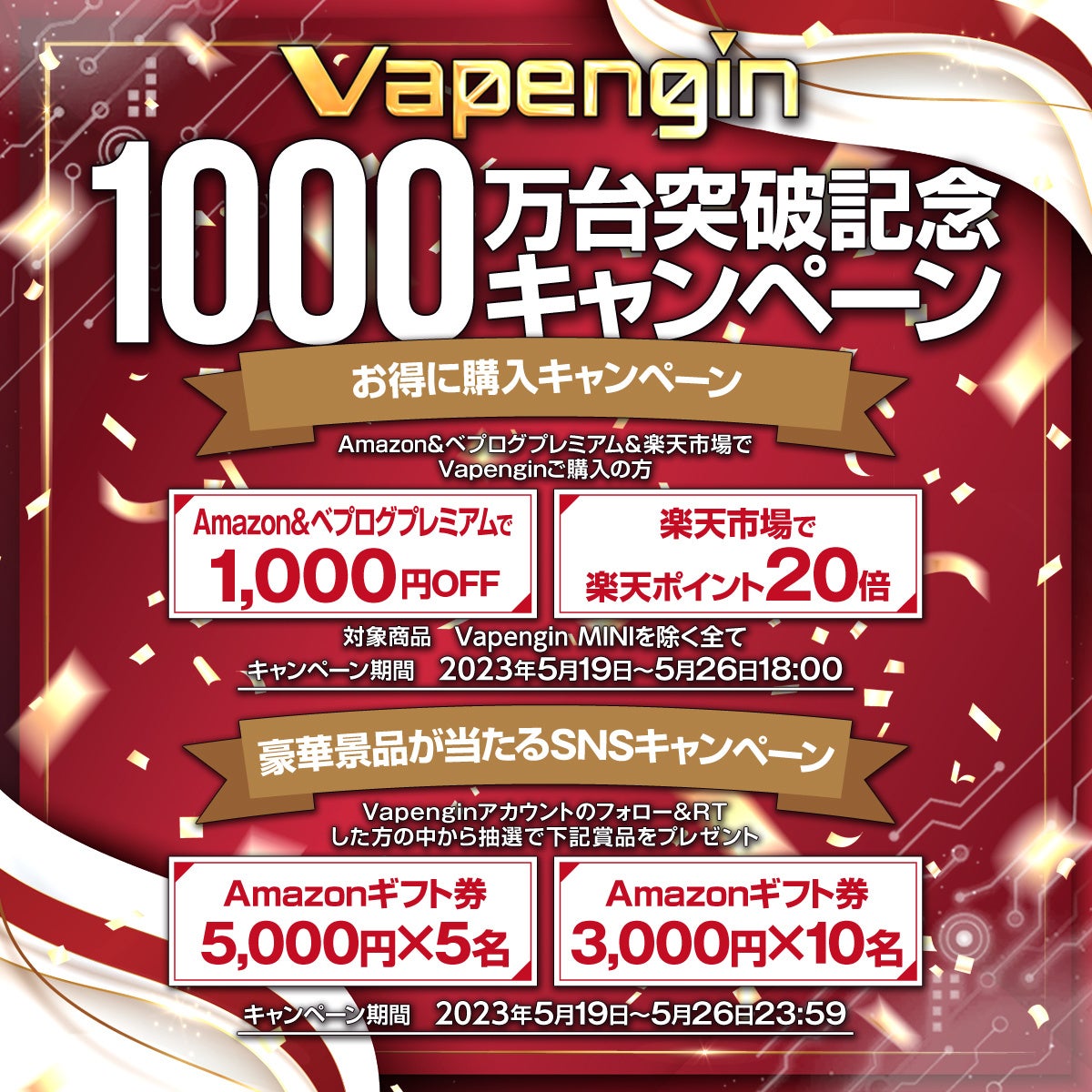 そして、この度Vapenginは全世界累計販売1,000万台を突破致しました。それを記念して「Vapengin1000万台突破記念キャンペーン」を5月19日から5月26日の期間で実施致します。