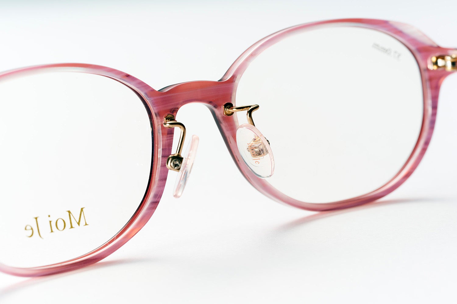ほんのりピンクカラーの鼻パッド、目もとに光を通すクリア色のオリジナル生地の採用など、メガネをかけるだけで、目もとや鼻筋にメイクのようなハイライト効果を発揮して、明るく華やかな印象をもたらします。