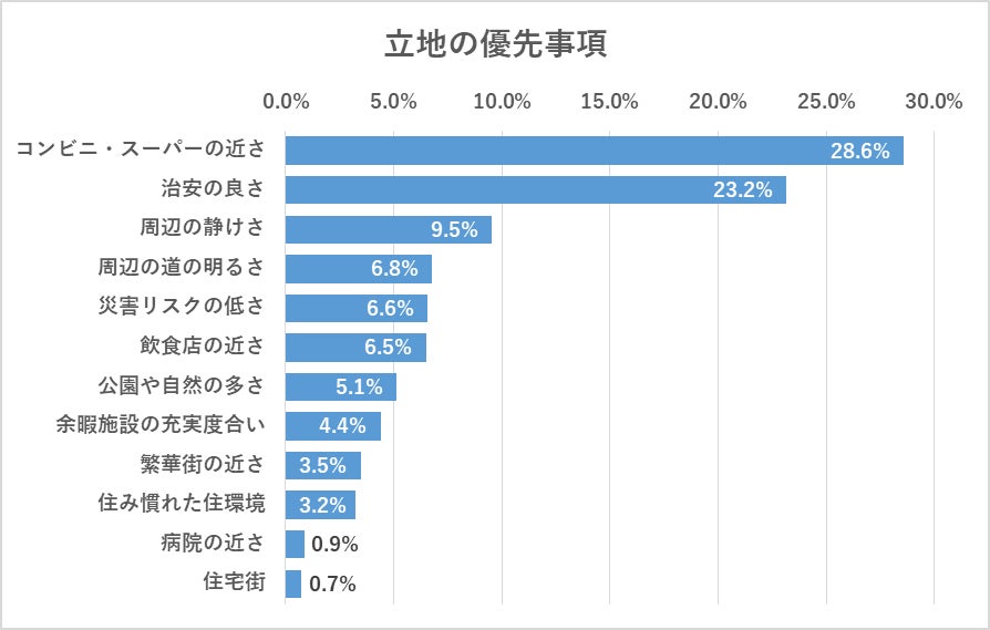 「コンビニ・スーパーの近さ」が28.6%と最も多く、次いで「治安の良さ」が23.2%、「周辺の静けさ」9.5%でした。