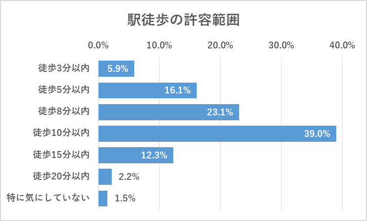 「徒歩10分以内」が1番多く39.0%、次いで「徒歩8分以内」23.1%、「徒歩5分以内」16.1%でした。徒歩10分以内と答えた方をすべて合わせると、84.1%にものぼります。