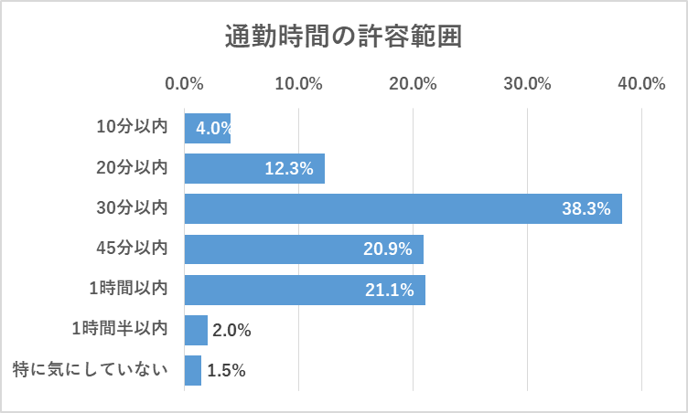 「30分以内」が38.3%と最も多く、次いで僅差で「1時間以内」が21.1%、「45分以内」が20.9%という結果になりました。
