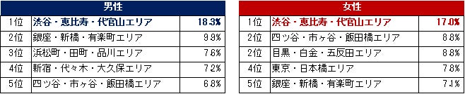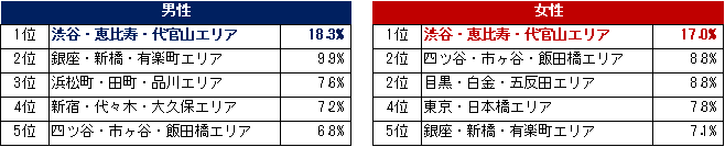 男性は、2位「銀座・新橋・有楽町エリア」(9.9%)、3位「浜松町・田町・品川エリア」とオフィスが立ち並ぶエリアが人気を集めています。また、4位、5位はともに新宿区のエリアとなりました。