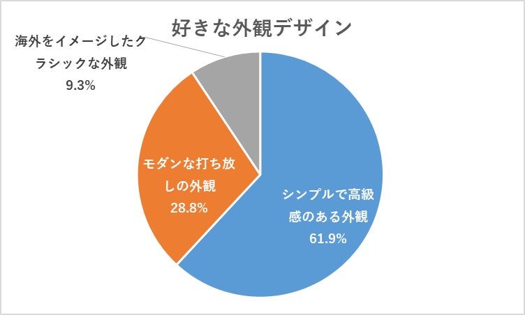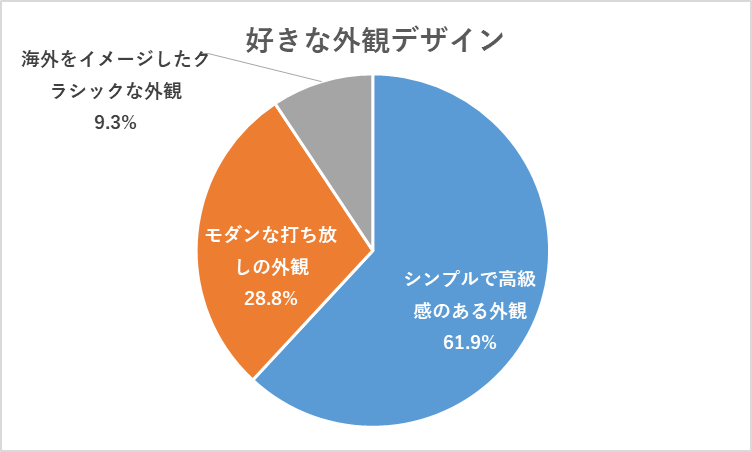 「シンプルで高級感のある外観」を好む人が61.9%と最も多く、「モダンな打ち放しの外観」が28.8%と続き、「海外をイメージしたクラシックな外観」が9.3%という結果になりました。