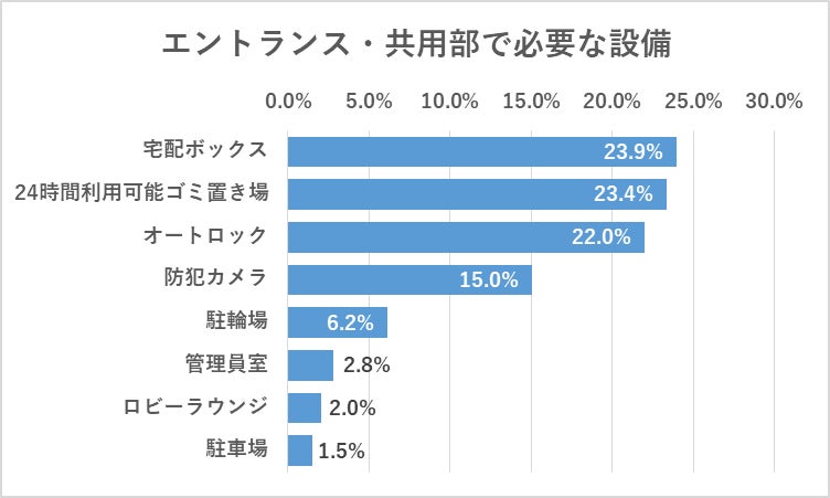 エントランス・共用部では、宅配ボックスなど生活リズムを崩さず暮らすための設備や、セキュリティ面を意識した設備がほしいと考えている方が多くみられました。