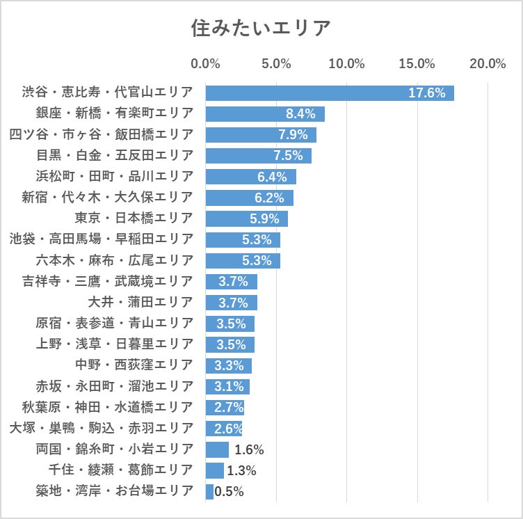 女性は、2位が同数で「四ツ谷・市ヶ谷・飯田橋エリア」「目黒・白金・五反田エリア」(8.8%)と、おしゃれで趣ある街並みが特徴的なエリアが上位に入っています。