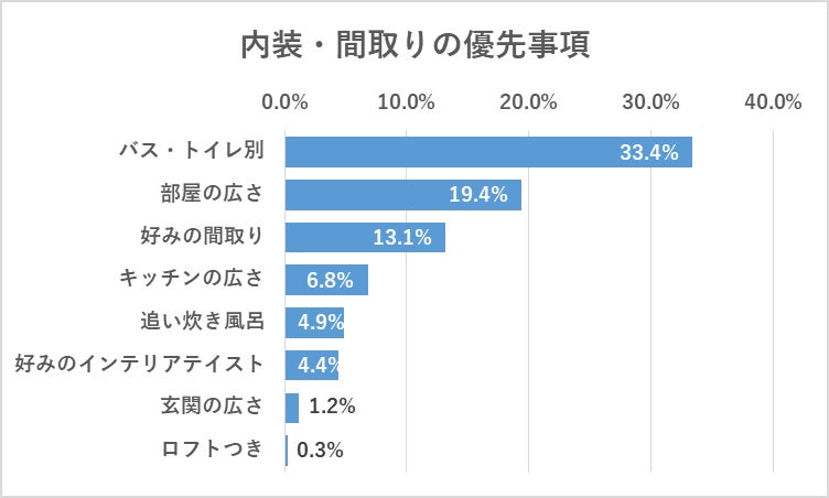 内装・間取りでは「バス・トイレ別」が33.4%と1番多く、2番目に19.4%で「部屋の広さ」、3番目に13.1%で「好みの間取り」となりました。