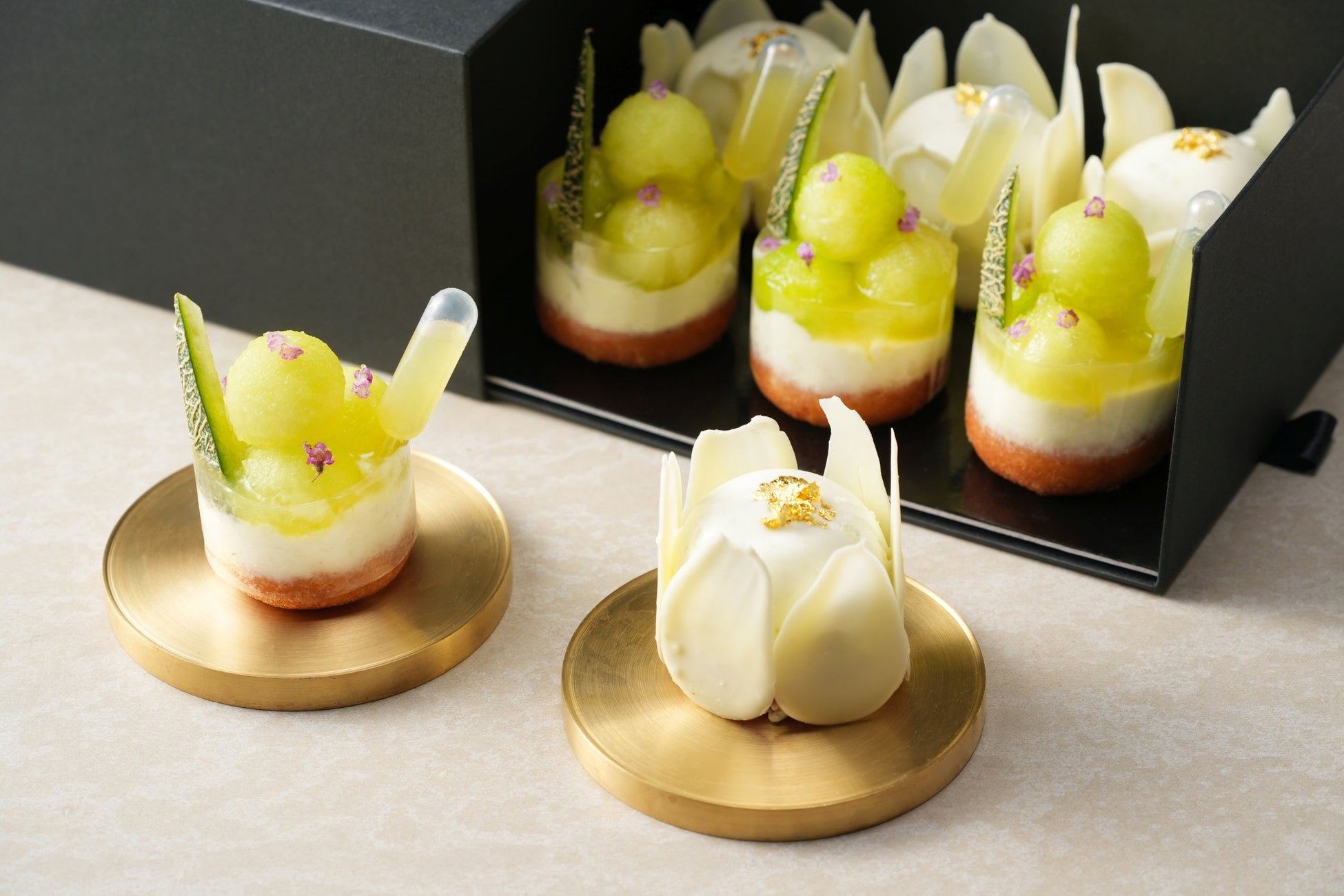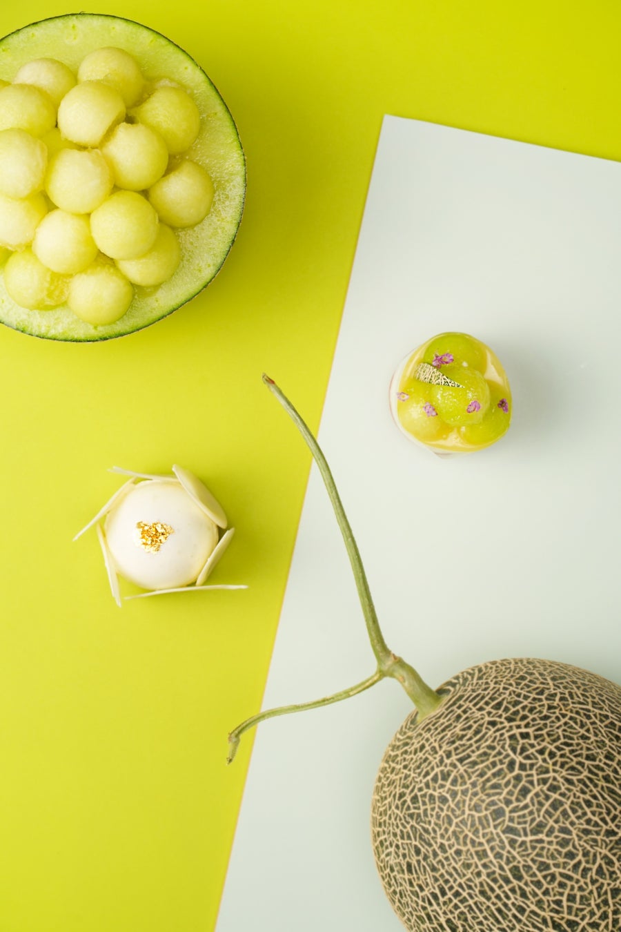 ホワイトチョコとコンデンスミルクのやさしい甘さに生クリームのコクを合わせたほんのりメロンが香るムースドーム。