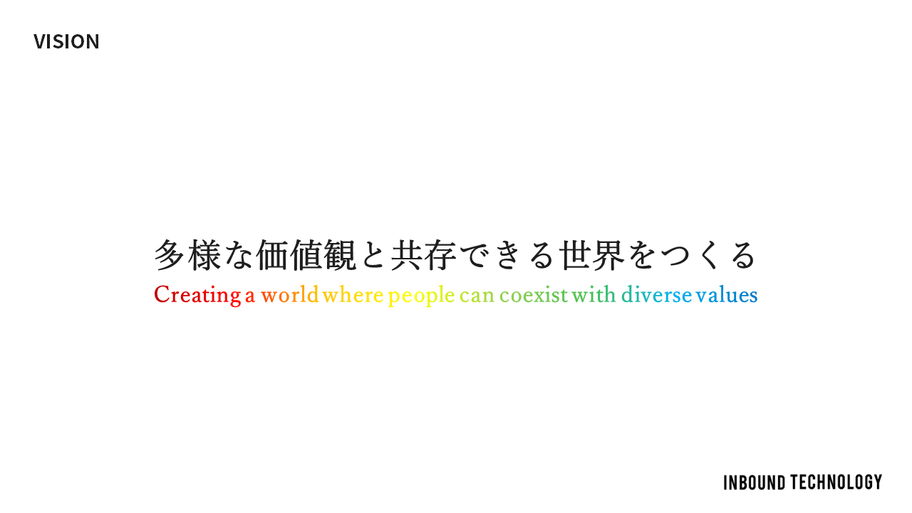 インバウンドテクノロジーは、「多様な価値観と共存できる世界をつくる」ことをビジョンとして掲げ、外国籍に特化した高度IT人材紹介サービス『World in Pro』をはじめとした人材紹介、生活支援、子ども教育等のサービスを提供しています。私たちが提供するサービスを通して、関わる全ての人々のLifestyle/Workstyle/Moneystyleに新しい改革を与え社会の当たり前を創り出します。