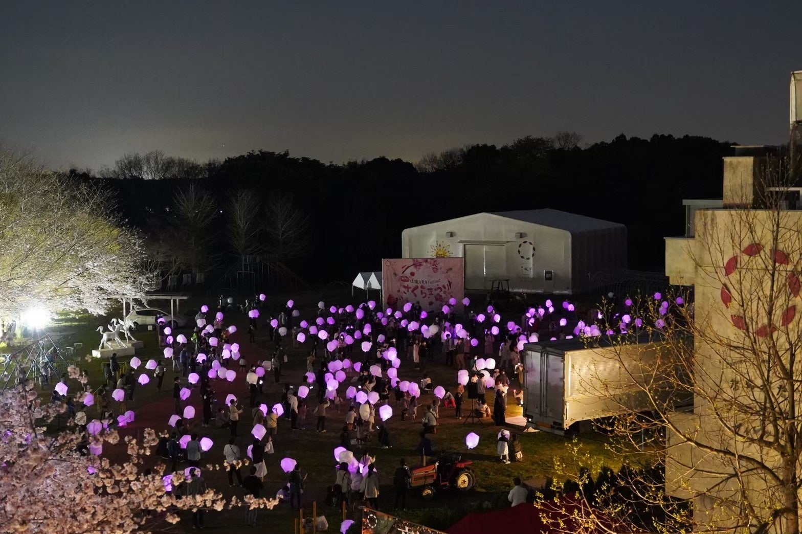 春の訪れを感じさせる桜の花々が美しく照らされ、ふんわりとした光に包まれるランタンバルーンがふわりと夜空へ舞い上がる光景は、まるで夢の中にいるかのような幻想的な雰囲気を演出します。参加者一人ひとりの願いを込めたランタンが、静かに夜空を彩り、会場全体が温かな光と感動に包まれる瞬間は、まさにこのフェスならではの特別な体験です。