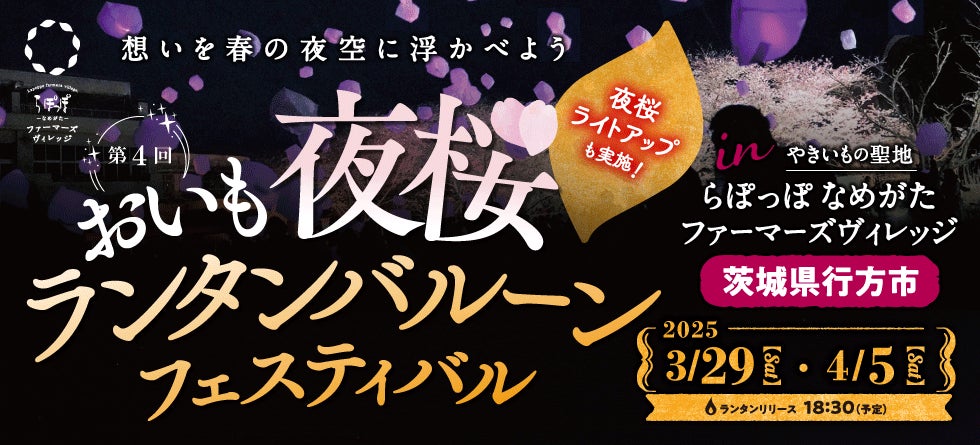 さつまいもスイーツ専門店「らぽっぽ」を運営する白ハト食品工業株式会社(本社:大阪府守口市、代表取締役社長:永尾 俊一)は、体験型農業テーマパーク「らぽっぽ なめがたファーマーズヴィレッジ」(所在地:茨城県行方市)にて、2025年3月29日(土)および4月5日(土)に今年で4回目となる「おいも夜桜ランタンバルーンフェスティバル2025」を開催いたします。