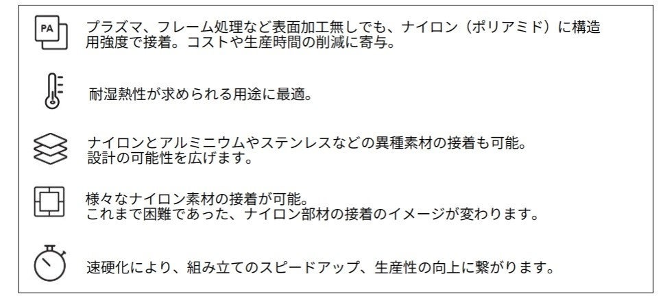 ナイロンは、強靭さ、耐熱性、耐薬品性など、高い性能を備えていることから、様々な分野で使われてきた素材です。反面、接着するのが難しい素材でもあります。高い強度で接合するには、プラズマ処理やフレーム処理などの表面処理をしてから接着が必要など、手間のかかる工程がありました。更に、異なる素材との接着も難易度が高いことから、今までは利用できる用途に限界がありました。