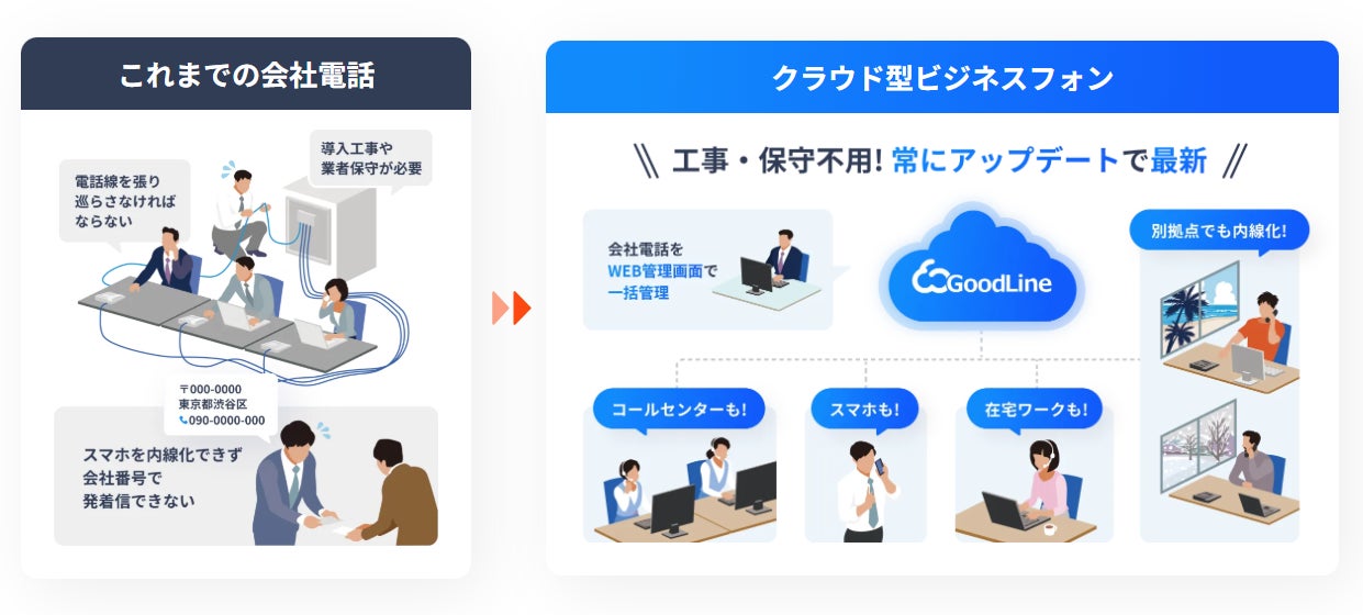 GoodLineは、企業の代表電話や内線といった会社電話の機能をクラウド上で一元管理できるクラウドPBXサービスです。