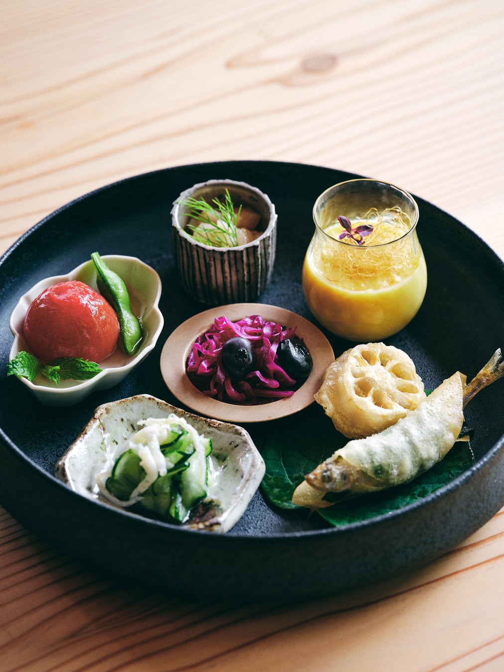 ■夕食(※未就学児以下はオプションでお子様プレート可能。) ・茨城産キャビア ・前菜盛り合わせ(以下は一例) ◆紫キャベツとブルーベリーのブレゼ ◆季節野菜のピュレ ◆れんこんのフリット / ワカサギの包み上げ ◆トマトのコンポート 枝豆添え ◆キャビアフィッシュのタルタル ◆瓜と白魚のガーリックオイルマリネ ・しゃぶしゃぶセット/ 季節生野菜盛り合わせ ・〆のお蕎麦 ・フルーツ
