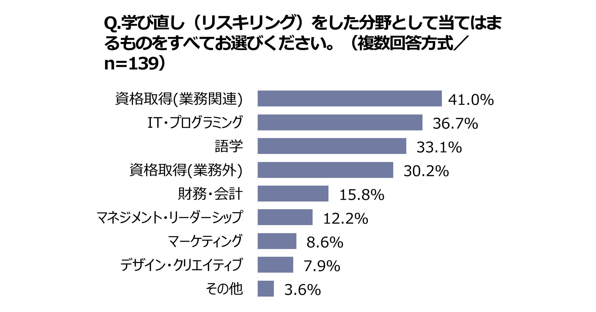 最も多いのは「取り組んだことがない」という回答で61.4%と半数以上にのぼりました。実際に取り組んでいる分野としては、「資格取得(業務関連)」が最も多い41%となりました。